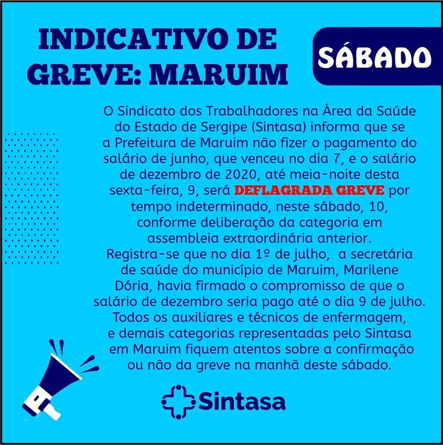 Conforme deliberação em assembleia recente, os funcionários da saúde, representados pelo Sindicato dos Trabalhadores na Área da Saúde do Estado de Sergipe (Sintasa), devem começar nesta quarta-feira, 9, uma greve por tempo indeterminado por conta do atraso salarial de maio, cuja rotina de atraso tem sido uma constante pela Prefeitura Municipal de Maruim. Diga-se que,
