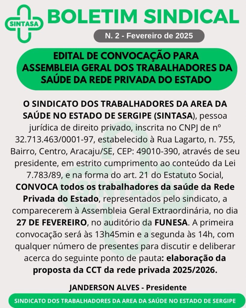 O Sindicato dos Trabalhadores na Área da Saúde do Estado de Sergipe (Sintasa) convoca todos os trabalhadores representados pela entidade para participarem da Assembleia Geral Extraordinária na próxima segunda-feira, 19 de maio, no auditório da FUNESA, com primeira chamada às 14h e segunda chamada às 14h15. A assembleia foi convocada após o sindicato anunciar oficialmente
