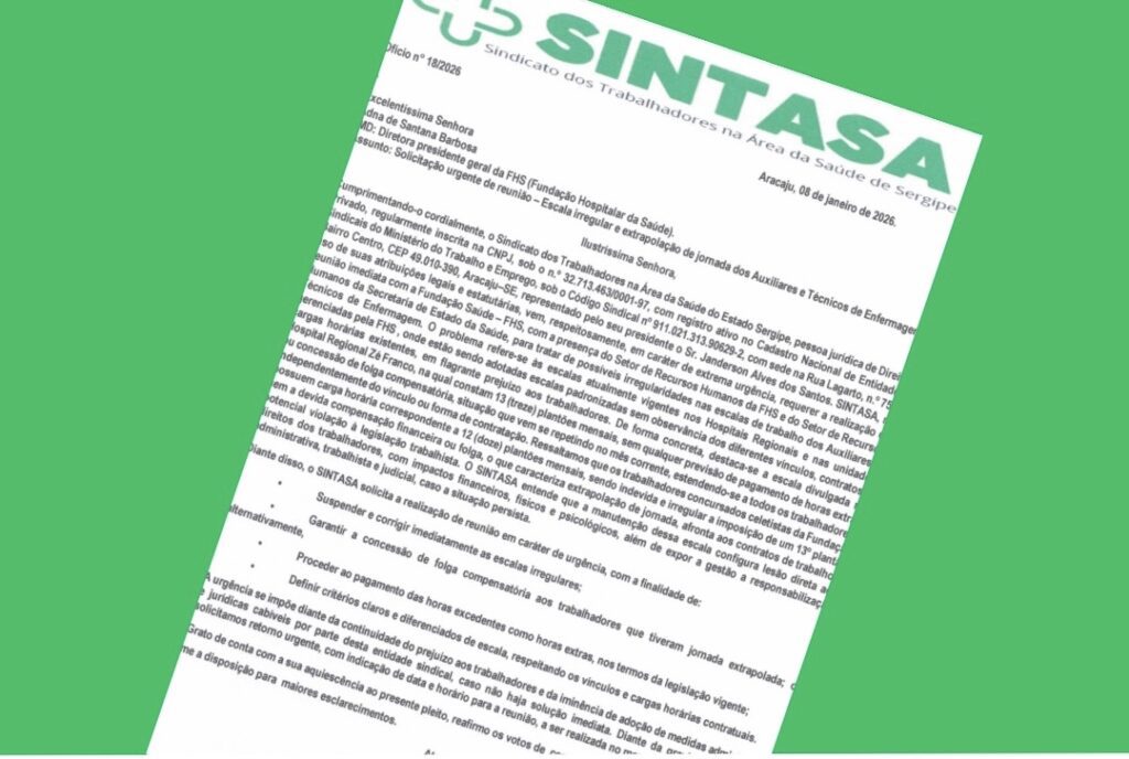 O Sindicato dos Trabalhadores na Área da Saúde do Estado de Sergipe (Sintasa) protocolou, nesta quinta-feira (8), o Ofício nº 18/2026 junto à Fundação Hospitalar da Saúde (FHS), solicitando, em caráter de extrema urgência, a realização de uma reunião para tratar de irregularidades nas escalas de trabalho dos auxiliares e técnicos de enfermagem que atuam […]