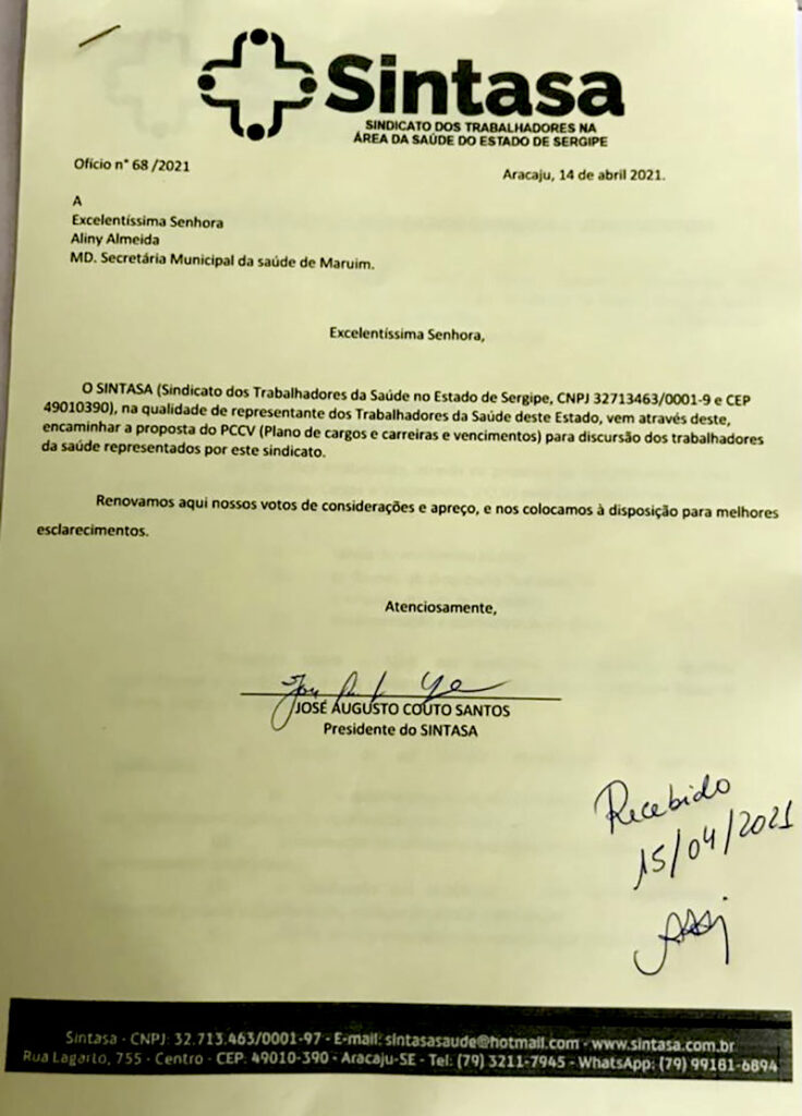 O presidente do Sindicato dos Trabalhadores na Área da Saúde do Estado de Sergipe (Sintasa), Augusto Couto, reuniu-se com a nova secretária de saúde de Maruim, Alyne Almeida, nesta quinta-feira, 15, e recebeu boas notícias para a categoria como o pagamento atrasado da folha integral de março, na última quarta-feira, e que o salário de dezembro de 2020 será pago no dia 11 de junho, além da criação de uma mesa de negociação.