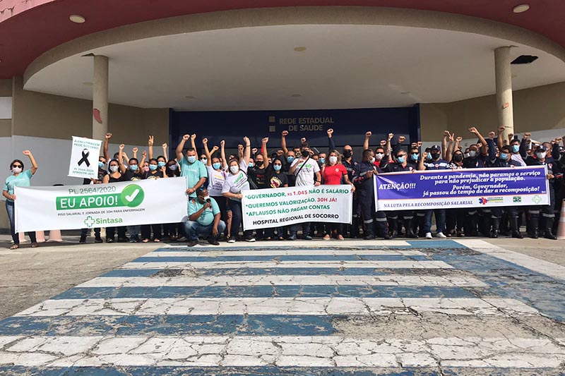 Os servidores da Secretaria de Estado da Saúde (SES) e da Fundação Hospitalar de Saúde (FHS), representados pelo Sindicato dos Trabalhadores na Área da Saúde do Estado de Sergipe (Sintasa) e pelo Sindicato dos Condutores de Ambulância do Estado de Sergipe (Sindiconam), realizaram uma paralisação de 24 horas, nesta quarta-feira, 25, com ato púbico, na frente da Secretaria de Estado da Saúde (SES).
