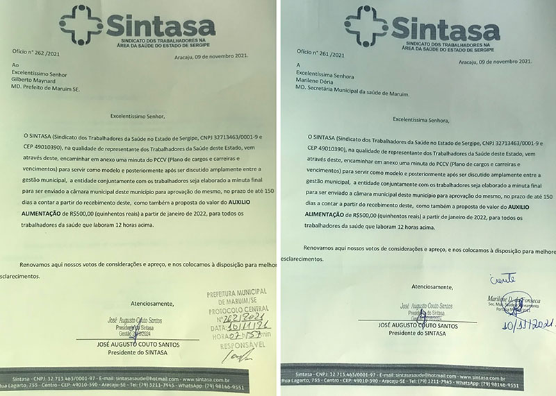 No protocolo, consta ainda a reivindicação do auxílio-alimentação de R$ 500,00 para todos os trabalhadores da saúde de Maruim, a partir de 12 horas, uma vez que eles não contam com este auxílio, com data de implantação para janeiro de 2022.