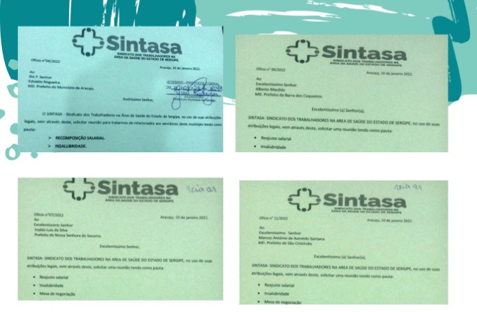 O Sindicato dos Trabalhadores na Área da Saúde do Estado de Sergipe (Sintasa) protocolou, na semana passada, uma série de ofícios na grande Aracaju, alcançando além da capital, Barra dos Coqueiros, São Cristóvão e Nossa Senhora do Socorro. A ideia é buscar reuniões para apresentar as reivindicações da categoria.