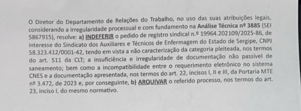 O Ministério do Trabalho indeferiu o pedido de criação do registro sindical do Sindicato dos Auxiliares e Técnicos de Enfermagem de Sergipe (SATESE). Com a decisão, o Sindicato dos Trabalhadores na Área da Saúde do Estado de Sergipe (SINTASA) permanece como a única entidade legalmente reconhecida para representar os técnicos e auxiliares de enfermagem em todo o estado.