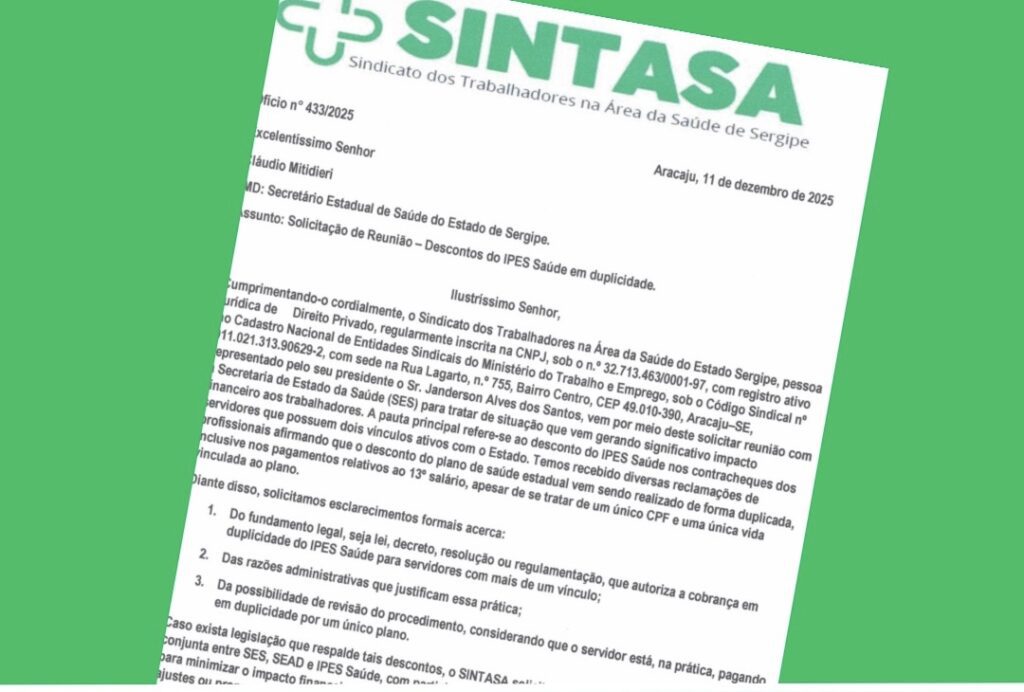 O Sindicato dos Trabalhadores na Área da Saúde de Sergipe (Sintasa) solicitou, nesta quinta-feira (11), uma reunião urgente com a Secretaria de Estado da Saúde (SES) para tratar dos descontos em duplicidade realizados pelo IPES Saúde nos contracheques de servidores com dois vínculos ativos. O presidente da entidade, Janderson Alves, afirma que a cobrança tem causado prejuízo financeiro significativo aos profissionais, inclusive no pagamento do 13º salário.